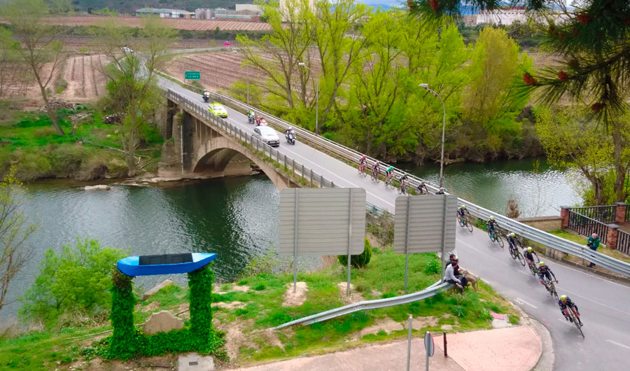Peloton de professionnels de La Vuelta a La Rioja traversant l'Èbre à Lapuebla de Labarca.