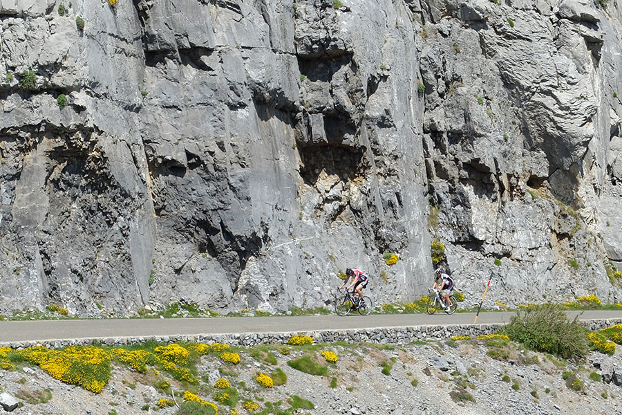 A partir de aquí, entre abundantes sombras, la pendiente se pone seria, rampas y muros se suceden, 10, 12, 14%, algún rellano para tomar aire y otra vez más de lo mismo durante 11 kilómetros que nos colocan en lo que se ha venido a llamar coll de Soudet y donde nos encontramos con la carretera que sube de Arette. En los tramos finales, antes de llegar a este punto, el paisaje se habrá ido despojando de arbolado y nos encontramos en un entorno de típicos pastizales de altura pirenaicos.
